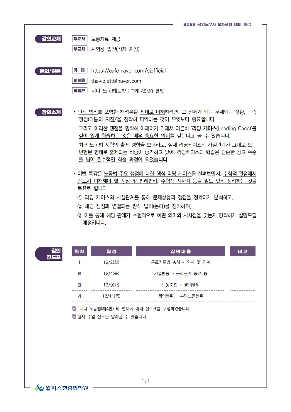 2026 이수진 노동법 리딩케이스 특강, 강의계획서