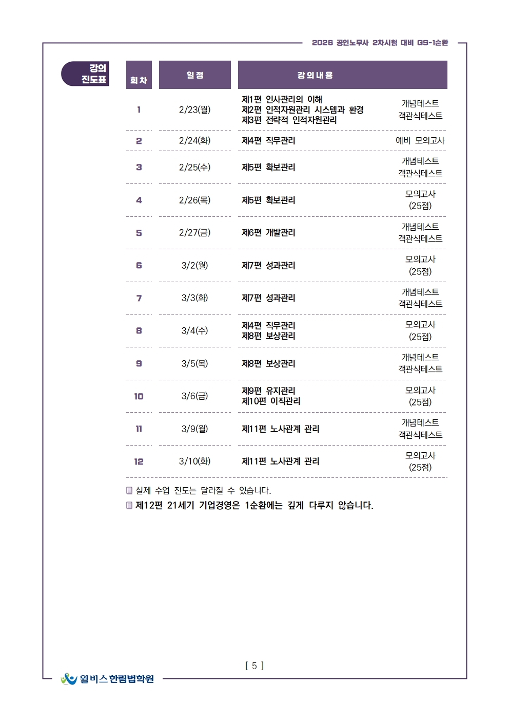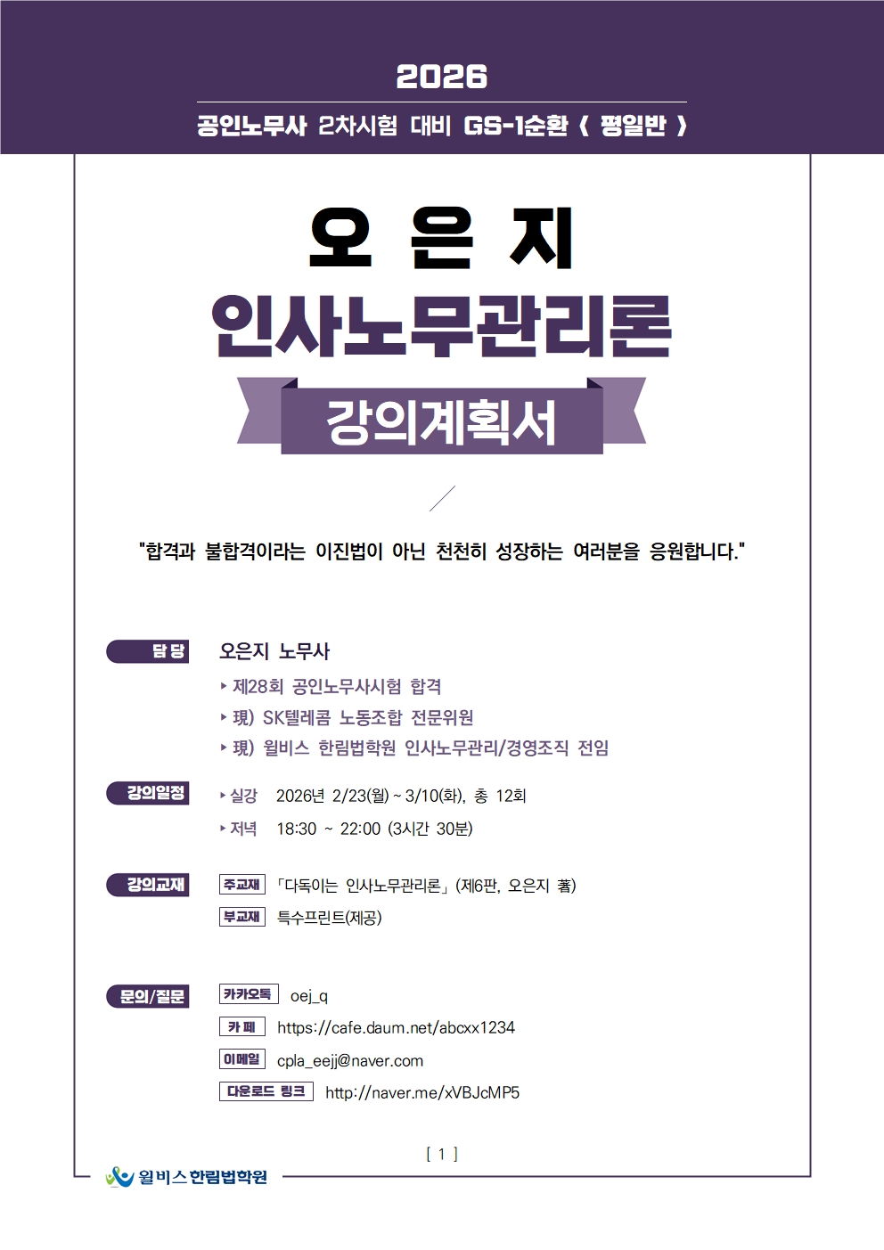 2026 GS-1순환 오은지 인사노무관리론 평일반, 강의계획서
