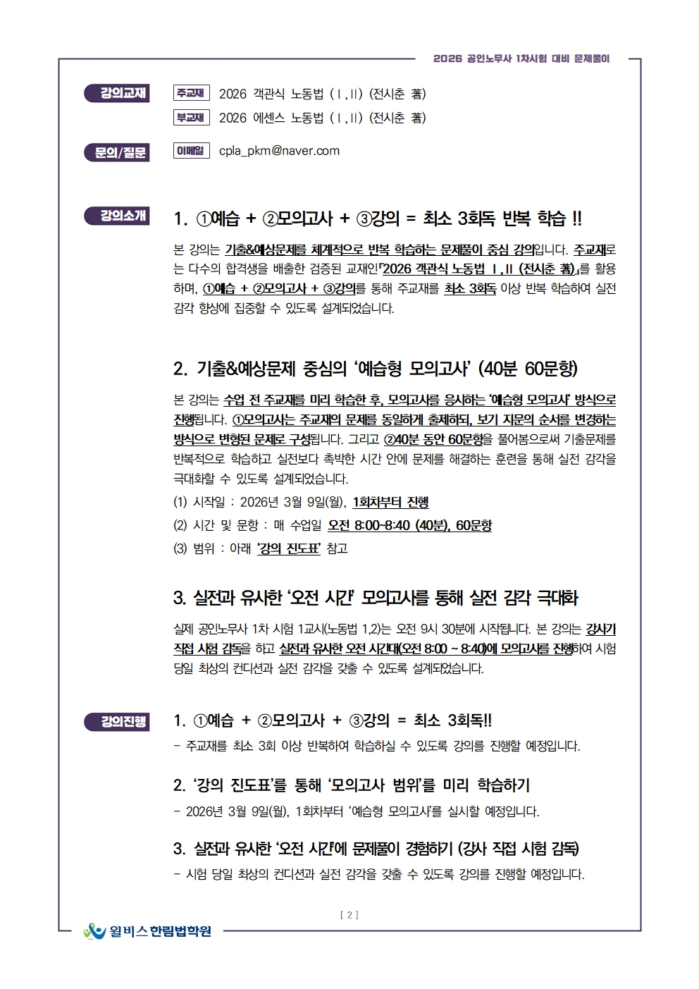 2026 1차 문제풀이 박경민 노동법, 강의계획서