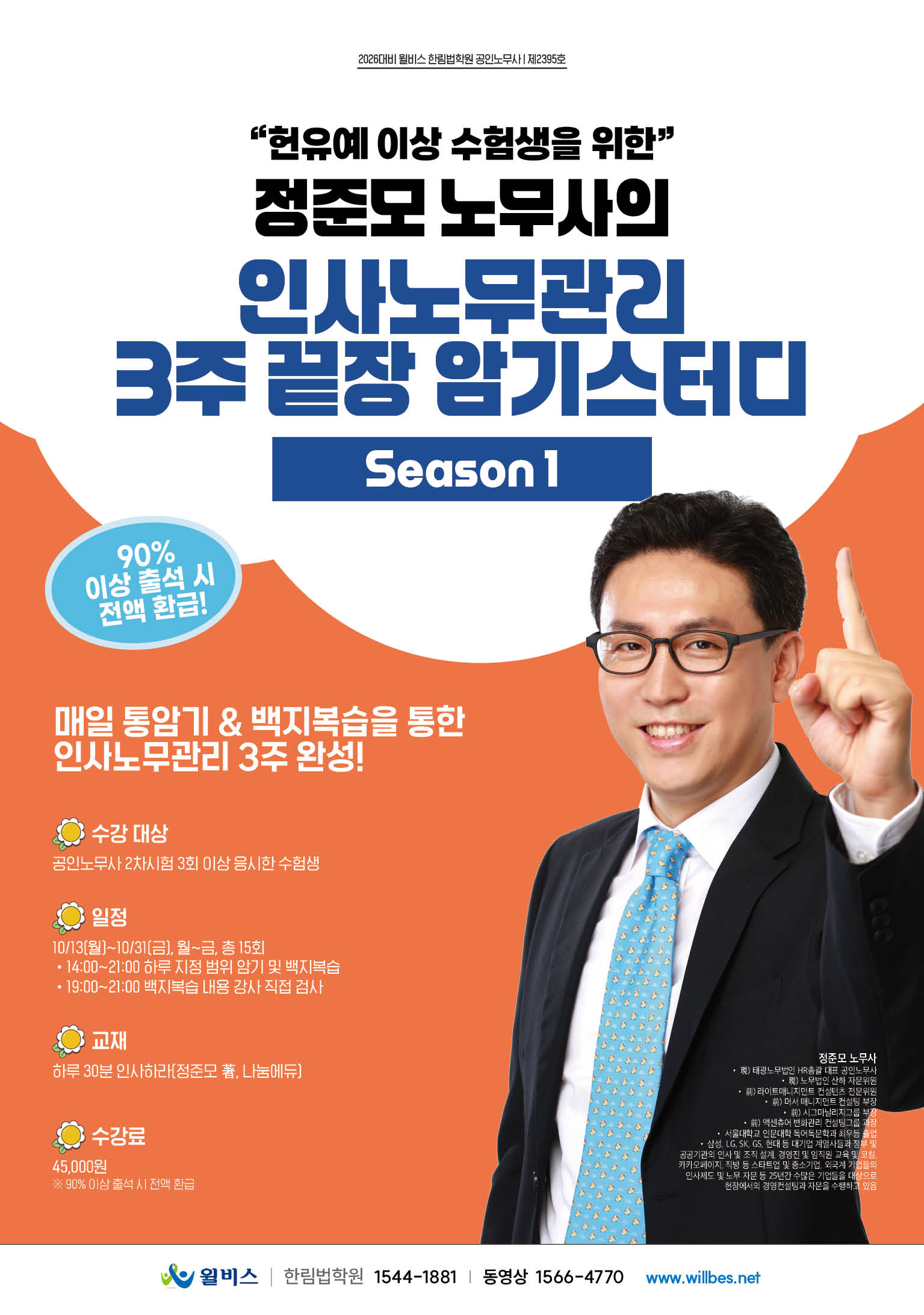 정준모 노무사의 인사노무관리 3주 끝장 암기스터디 - 10/13(월) 개강