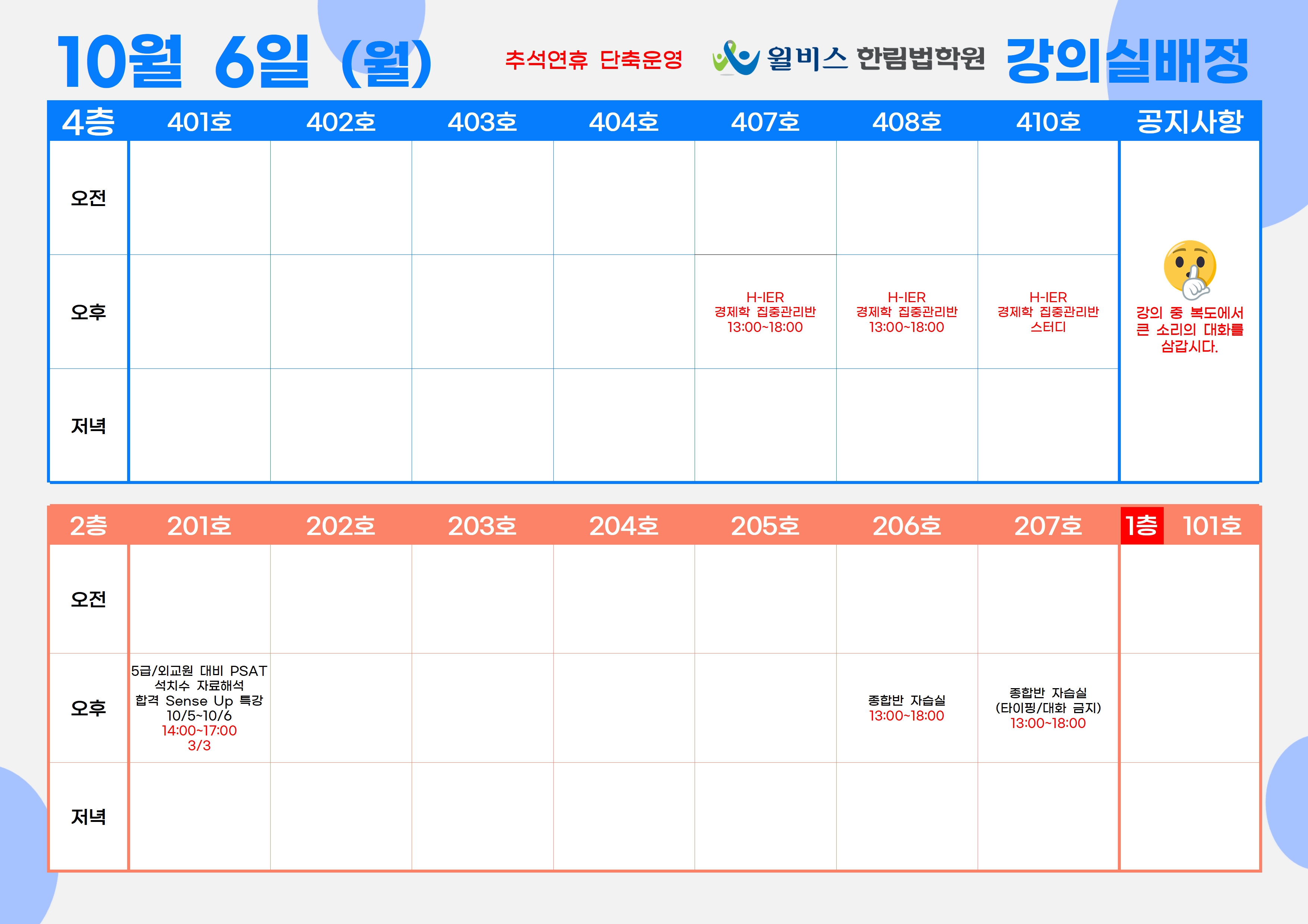 10월 5일(일) 강의실 배정표