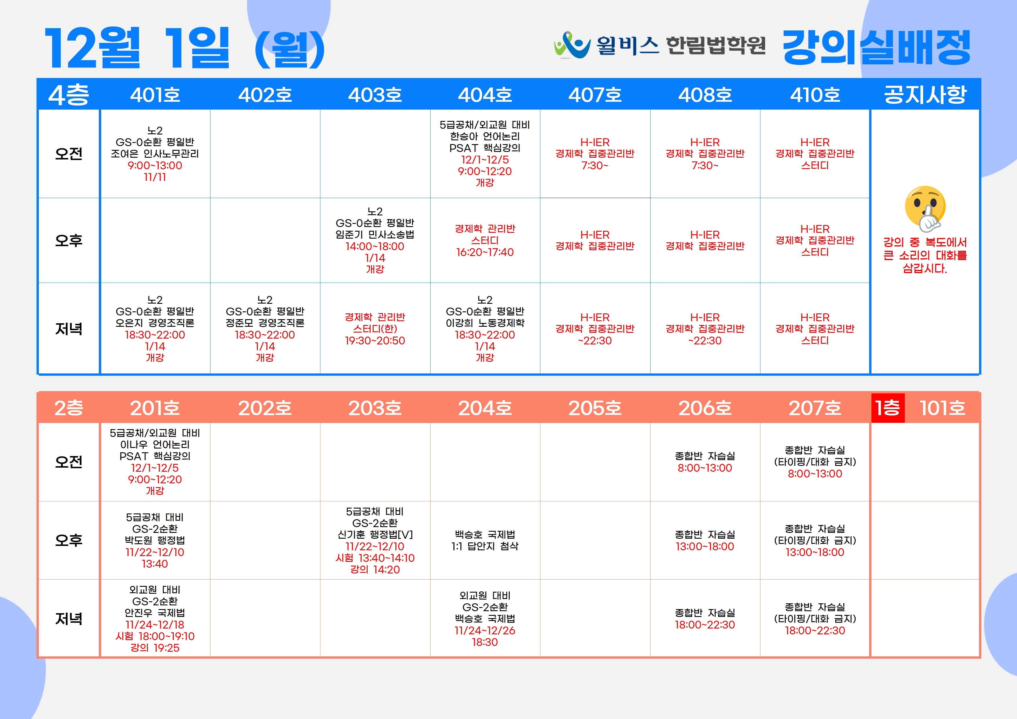 12월 1일(월) 강의실 배정표