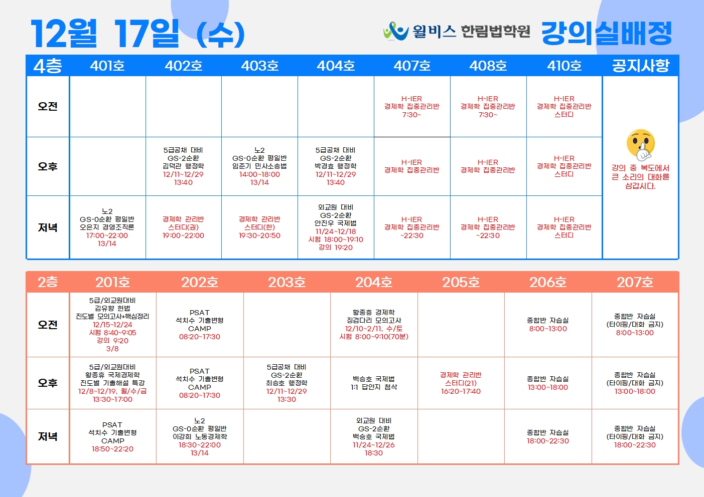 12월 17일(수) 강의실 배정표