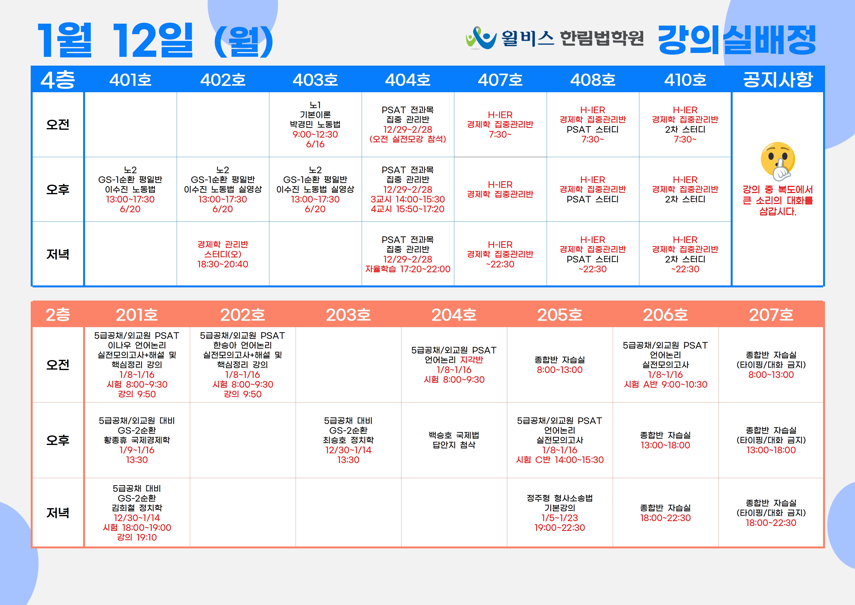 1월 12일(월) 강의실 배정표
