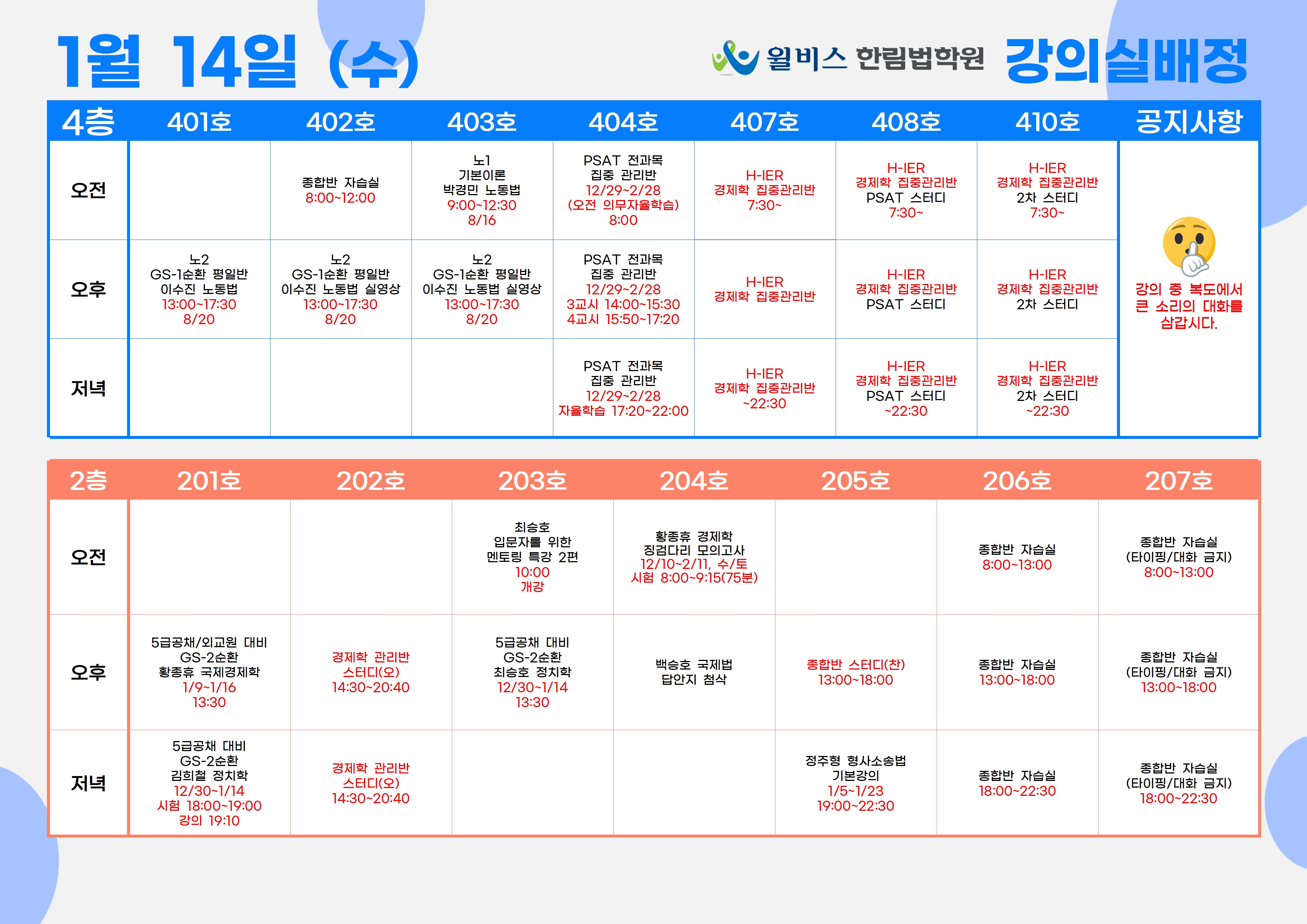 1월 14일(수) 강의실 배정표