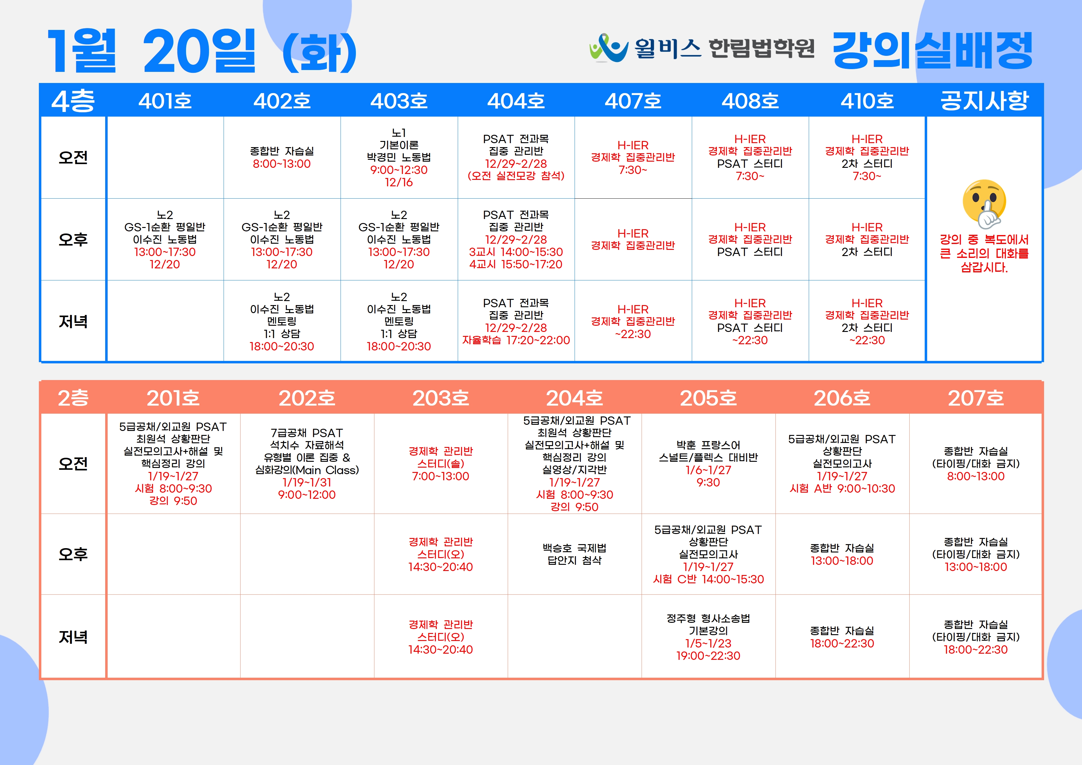 1월 20일(화) 강의실 배정표