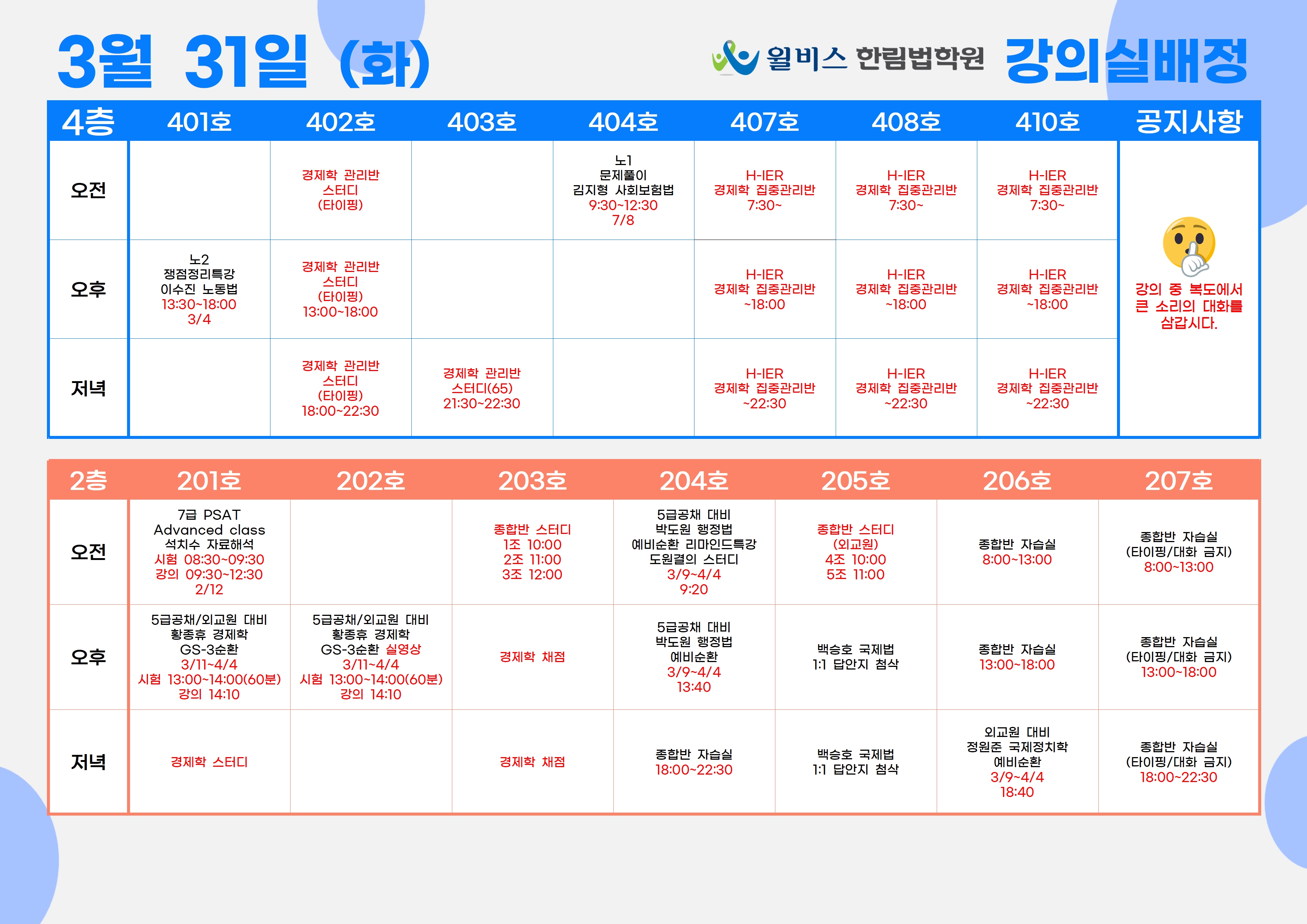3월 31일(화) 강의실 배정표