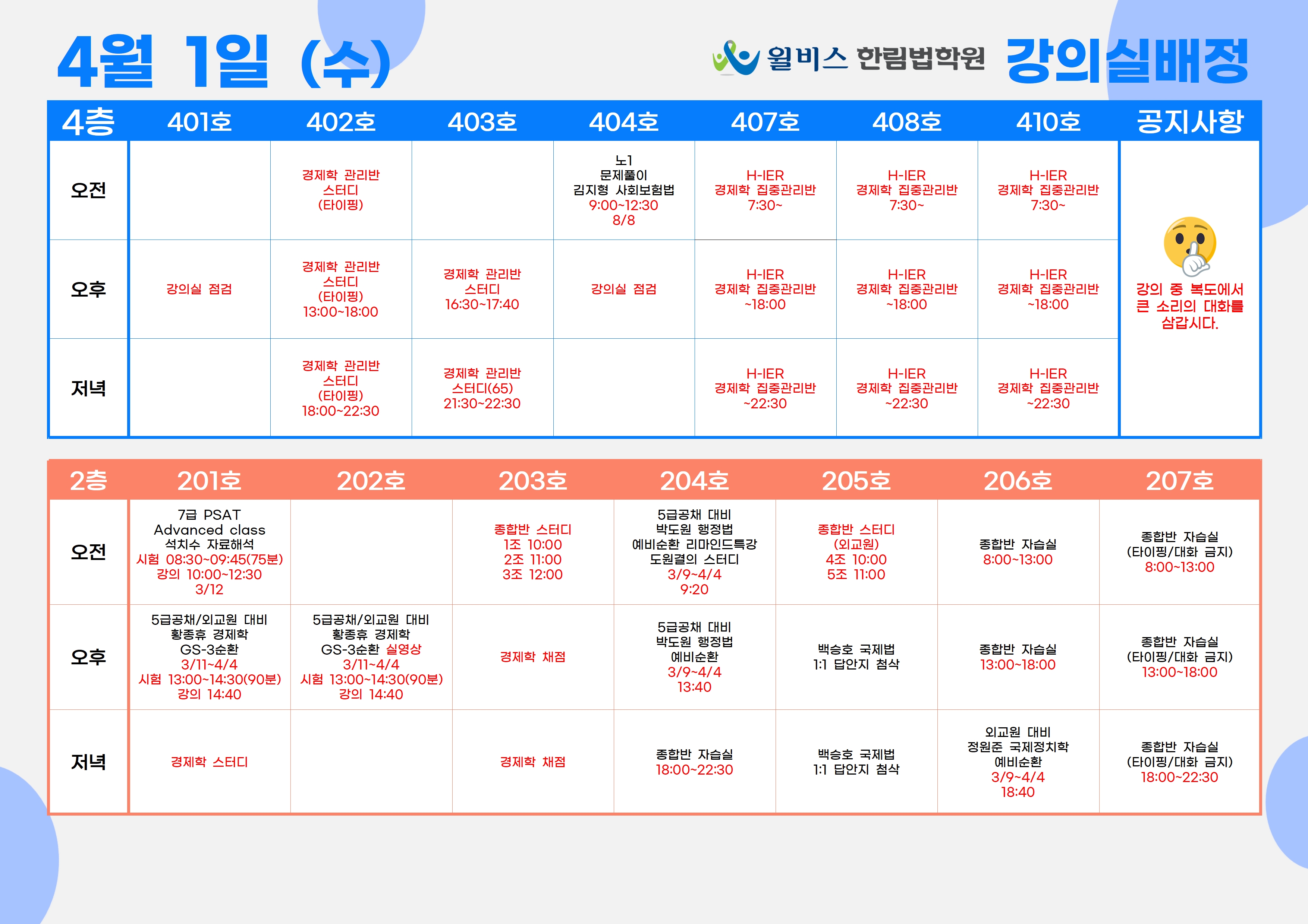 4월 1일(수) 강의실 배정표