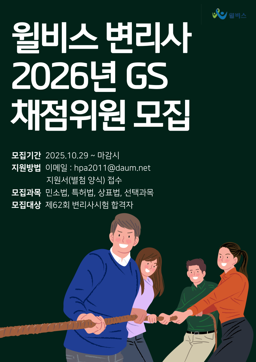 윌비스 변리사학원에서 2026 GS 채점위원을 모집합니다.