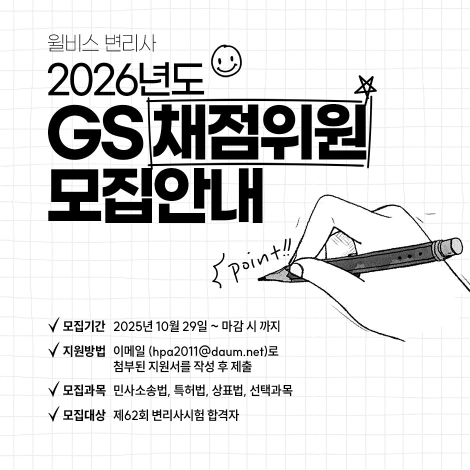 윌비스 변리사학원에서 2026 GS 채점위원을 모집합니다.